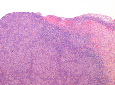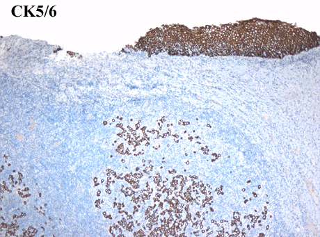 Lymphoepithelioma-like carcinoma of the cervix is an uncommon variant of poorly differentiated non-keratinizing squamous cell carcinoma. Its morphology is similar to that of the nasopharyngeal lymphoepithelioma-like carcinoma. Malignant cells show abundant eosinophilic cytoplasm with large nuclei and prominent nucleoli. The cellular borders are indistinct, which confers a syncytial appearance. The carcinoma is accompanied by an intense inflammatory reaction. The main differential diagnosis is lymphoma: identification of cohesive cellular clusters and positive immunohistochemical staining for p63 or cytokeratin 5/6 usually easily confirm the diagnosis. Epstein-Barr virus DNA has been identified in some cases in the Asian population, but only rarely in the western population. Therefore, the role of EBV in the pathogenesis of lymphoepithelioma-like carcinoma is uncertain and there might be geographical variations. The role of human papilloma virus infection also remains unclear.